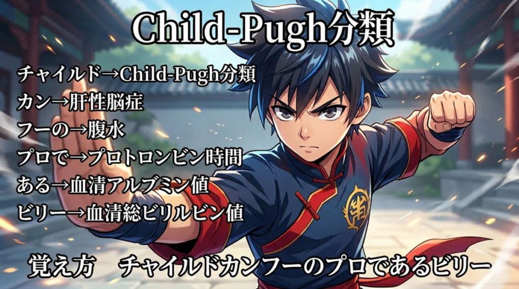 Child-Pugh分類の覚え方(ゴロ)【チャイルドカンフーのプロであるビリー】