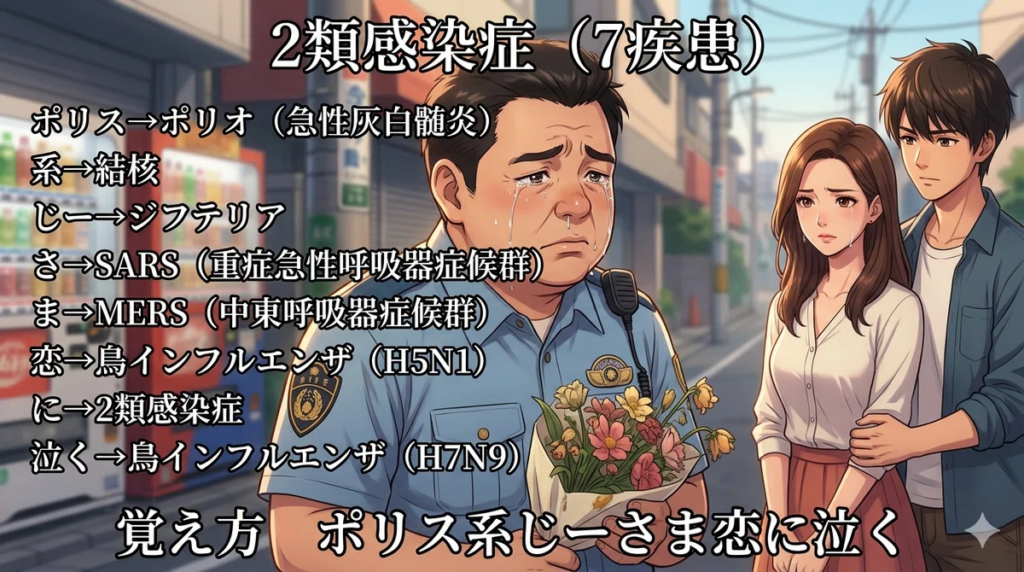 2類感染症(7疾患)の覚え方(ゴロ)【ポリス系じーさま恋に泣く】