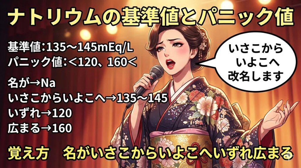 ナトリウムの基準値とパニック値の覚え方(ゴロ)【名がいさこからいよこへいずれ広まる】