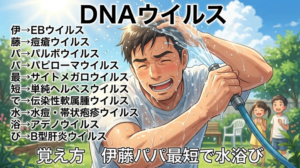 DNAウイルスの覚え方(ゴロ)【伊藤パパ最短で水浴び】