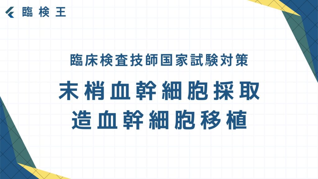 過去問を解いてみよう! では実際に過去10年分の国家試験(第62~71回臨床検査技師国家試験)から末梢血幹細胞採取・造血幹細胞移植について出題された問題を5問解いてみよう! 出典:厚生労働省ホームページ第64回臨床検査技師国家試験問題および正答につ... -