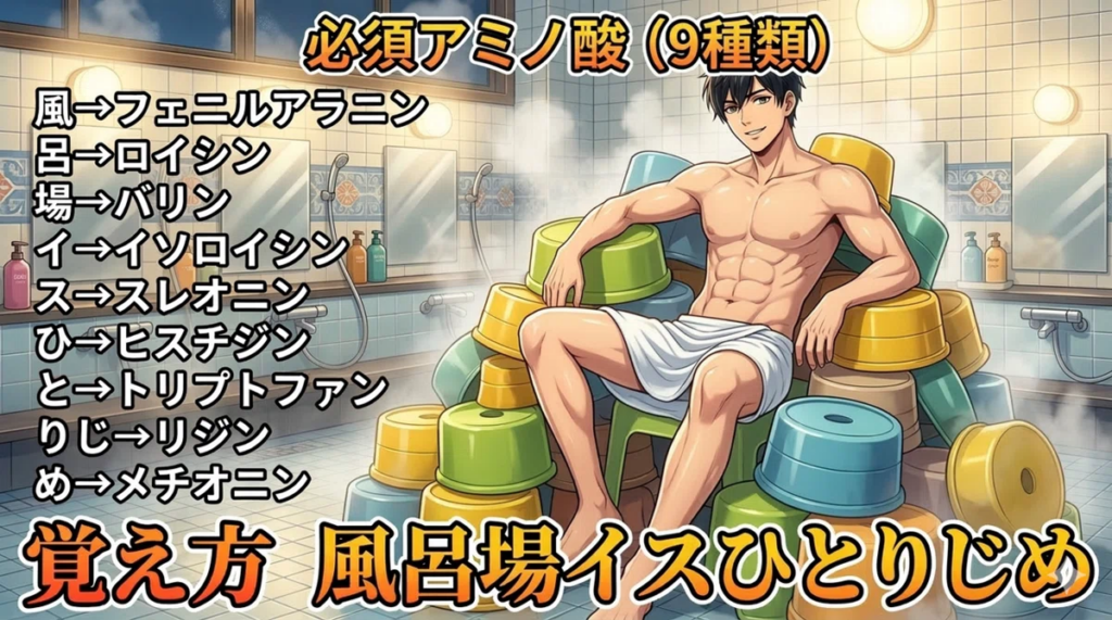 必須アミノ酸の覚え方(ゴロ)【風呂場イスひとりじめ】 2026 4/02 臨床化学 2026年4月2日 当ページのリンクには広告が含まれています。 スポンサーリンク 目次必須アミノ酸の覚え方(ゴロ) 風→フェニルアラニン呂→ロイシン場→バリンイ→イソロイシンス→スレオニンひ→ヒスチジンと→トリプトファンりじ→リジンめ→メチオニン 覚え方風呂場イスひとりじめ スポンサーリンク 臨床化学 よかったらシェアしてね! URLをコピーしました! URLをコピーしました! エンベロープを持たないウイルスの覚え方(ゴロ)【映画『ポリオパパのアロエ』】 この記事を書いた人 臨検王 関連記事 コリンエステラーゼ(問題のみ)【3回/10年】 2026年1月10日 抗凝固剤(問題のみ)【5回/10年】 2026年1月10日 飛行時間型質量分析〈TOF-MS〉(問題のみ)【2回/10年】 2025年12月27日 LD(乳酸デヒドロゲナーゼ)(問題のみ)【6回/10年】 2025年12月27日 尿酸(問題のみ)【5回/10年】 2025年12月27日 必須脂肪酸(問題のみ)【1回/10年】 2025年12月27日 クロマトグラフィ(問題のみ)【3回/10年】 2025年12月22日 ビリルビン(問題のみ)【5回/10年】 2025年12月22日