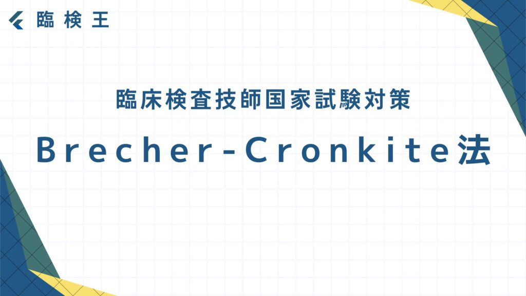 過去問を解いてみよう! では実際に過去10年分の国家試験(第62~71回臨床検査技師国家試験)からBrecher-Cronkite法について出題された問題を2問解いてみよう! 出典:厚生労働省ホームページ第62回臨床検査技師国家試験の問題および正答についてhttps://w... -