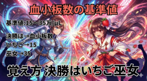 白血球数の基準値の覚え方(ゴロ)【初の産後まるまる苦戦】 2026 4/03 臨床血液学 2026年4月12日 当ページのリンクには広告が含まれています。 スポンサーリンク 目次白血球数の基準値の覚え方(ゴロ) 基準値:3500〜9000/μL 初の→白血球数産後まるまる→3500苦戦→9000 覚え方初の産後まるまる苦戦 スポンサーリンク 臨床血液学 よかったらシェアしてね! URLをコピーしました! URLをコピーしました! 血小板数の基準値の覚え方(ゴロ)【決勝はいちご巫女】 この記事を書いた人 臨検王 関連記事 血小板数の基準値の覚え方(ゴロ)【決勝はいちご巫女】 2026年4月11日 ビタミンK依存性因子の覚え方(ゴロ)【にくなっとうのプロテイン】 2026年4月10日 血清と血漿(問題のみ)【3回/10年】 2026年3月31日 鉄欠乏性貧血貧血(問題のみ)【2回/10年】 2025年12月30日 造血器腫瘍における染色体異常と関与する遺伝子(問題のみ)【6回/10年】 2025年12月29日 フローサイトメトリ法(問題のみ)【8回/10年】 2025年12月29日 クロスミキシング試験(問題のみ)【2回/10年】 2025年12月29日 赤血球指数による貧血の分類(問題のみ)【3回/10年】 2025年12月29日